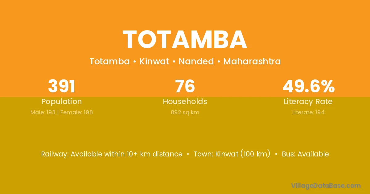 Kinwat (100 km) is the nearest town to Totamba village for major economic activities and is located approximately 100 km away.