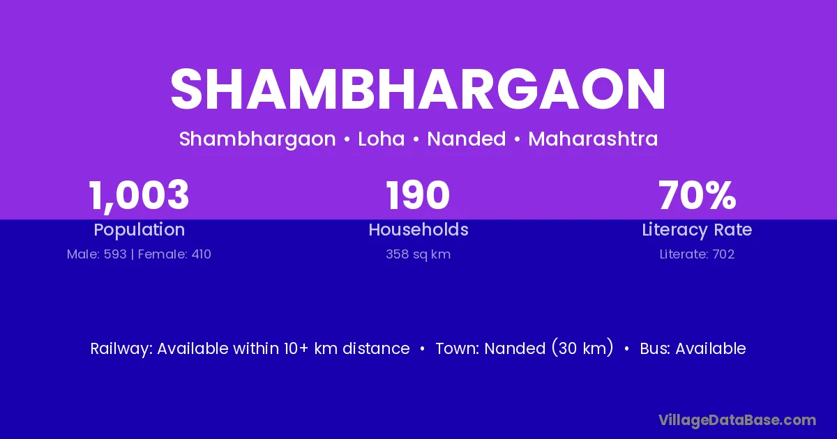 Nanded (30 km) is the nearest town to Shambhargaon village for major economic activities and is located approximately 30 km away.