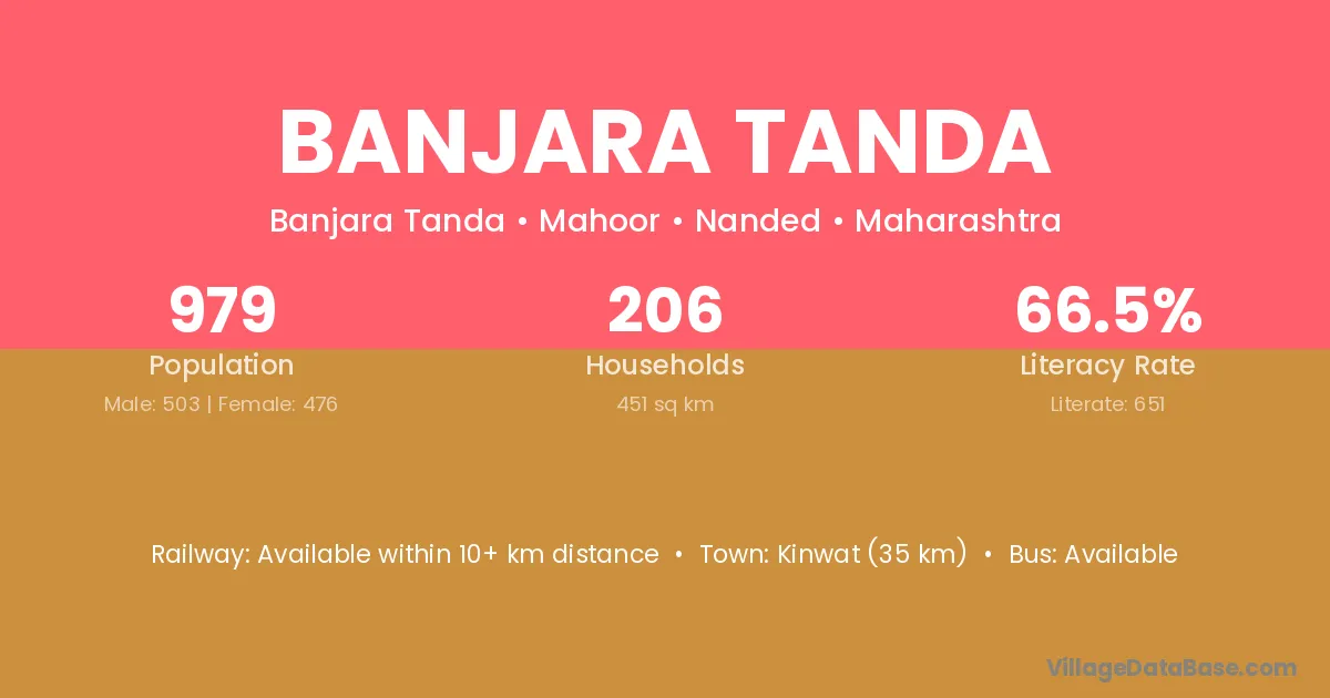 Banjara Tanda village has a total population of 979 people, of which 503 are males and 476 are females.