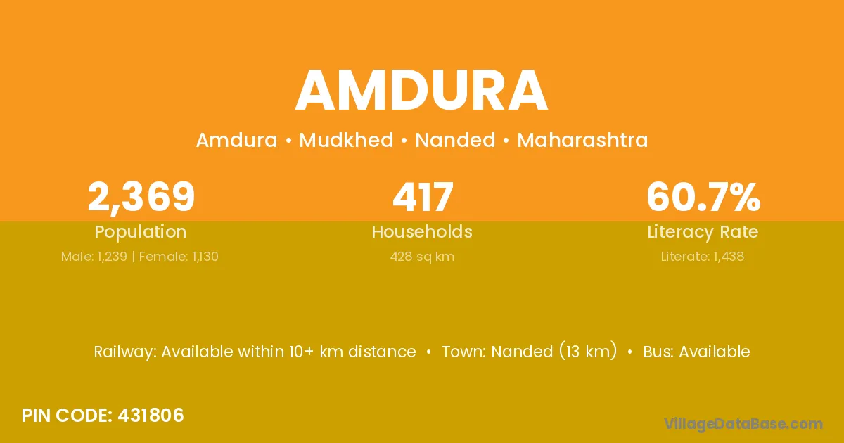 Nanded (13 km) is the nearest town to Amdura village for major economic activities and is located approximately 13 km away.