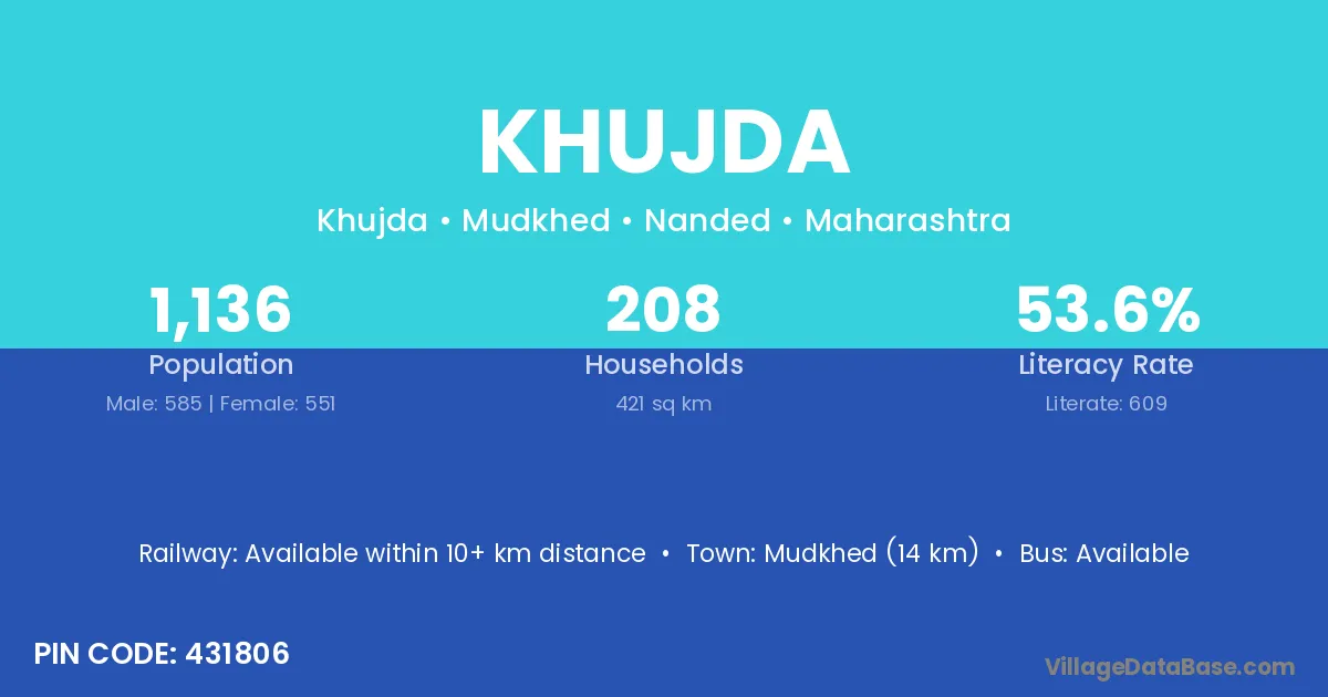 Mudkhed (14 km) is the nearest town to Khujda village for major economic activities and is located approximately 14 km away.