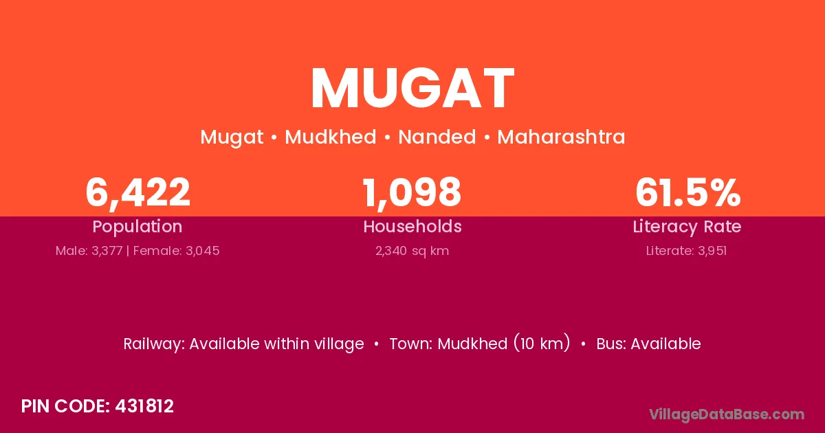 Mudkhed (10 km) is the nearest town to Mugat village for major economic activities and is located approximately 10 km away.