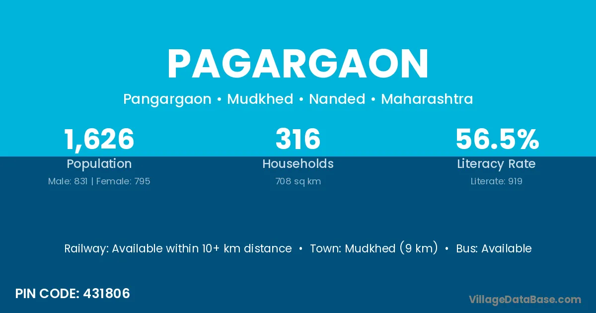 Mudkhed (9 km) is the nearest town to Pagargaon village for major economic activities and is located approximately 9 km away.