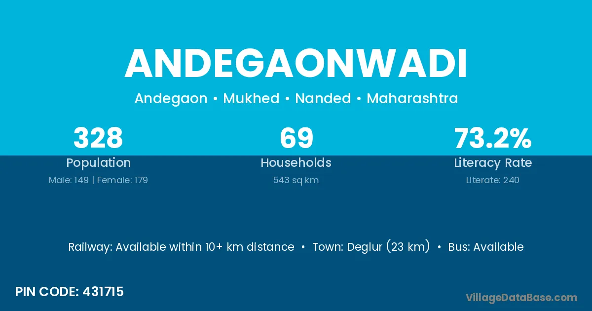 Deglur (23 km) is the nearest town to Andegaonwadi village for major economic activities and is located approximately 23 km away.