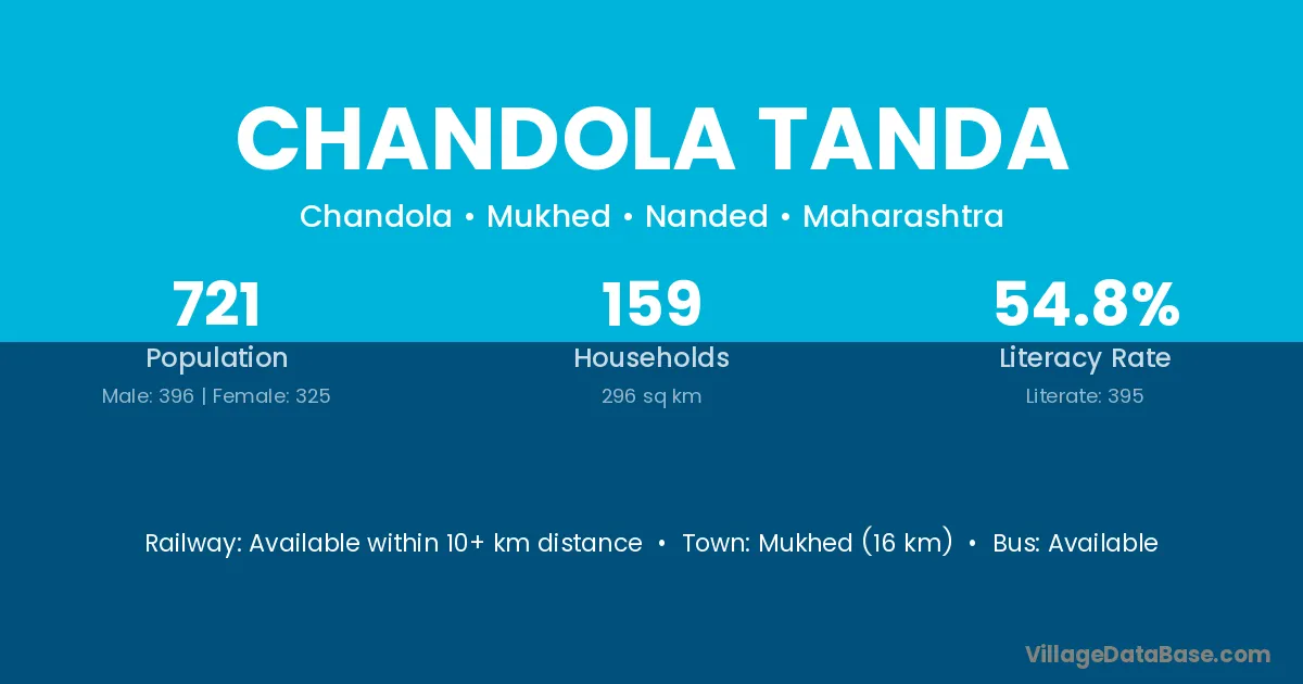 Mukhed (16 km) is the nearest town to Chandola Tanda village for major economic activities and is located approximately 16 km away.