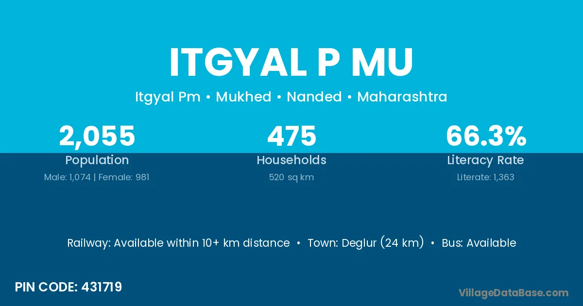 Deglur (24 km) is the nearest town to Itgyal P Mu village for major economic activities and is located approximately 24 km away.