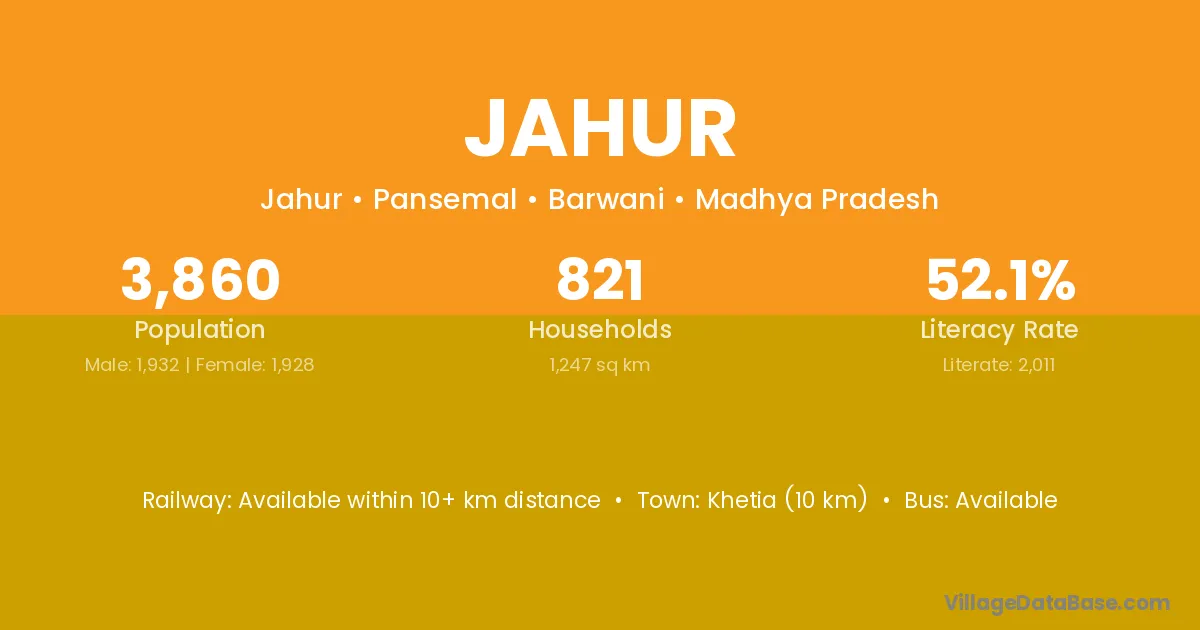Jahur village has a total population of 3,632 people, of which 1,823 are males and 1,809 are females.