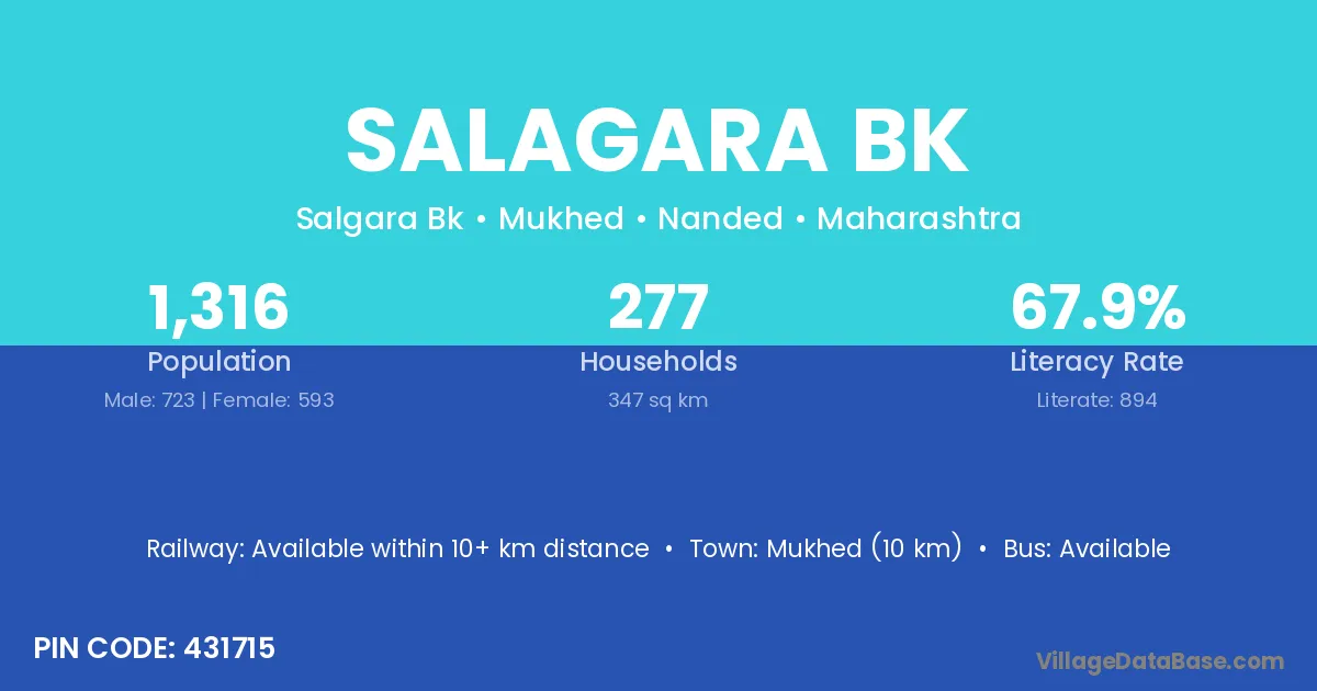 Mukhed (10 km) is the nearest town to Salagara Bk village for major economic activities and is located approximately 10 km away.
