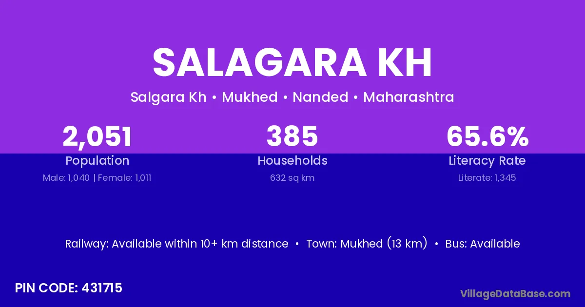 Mukhed (13 km) is the nearest town to Salagara Kh village for major economic activities and is located approximately 13 km away.