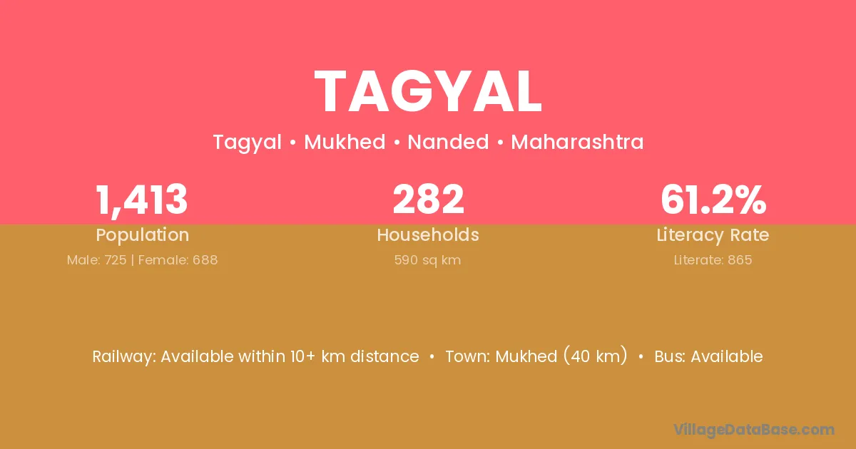 Mukhed (40 km) is the nearest town to Tagyal village for major economic activities and is located approximately 40 km away.