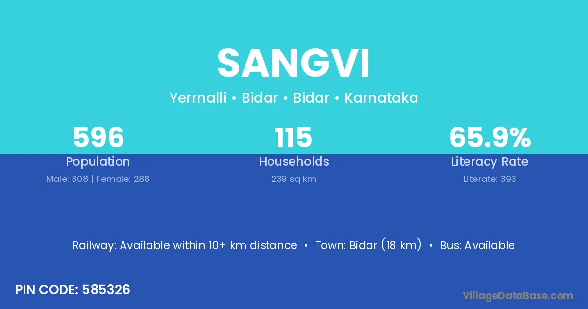 The literacy rate of Sangvi village is 63.98%. Male literacy stands at 69.99% and female literacy at 57.60%.