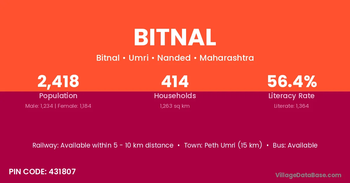 Peth Umri (15 km) is the nearest town to Bitnal village for major economic activities and is located approximately 15 km away.