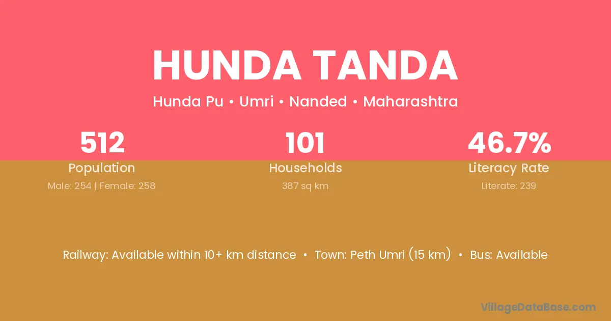 Peth Umri (15 km) is the nearest town to Hunda Tanda village for major economic activities and is located approximately 15 km away.