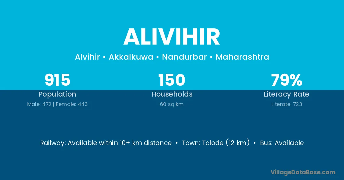 Talode (12 km) is the nearest town to Alivihir village for major economic activities and is located approximately 12 km away.