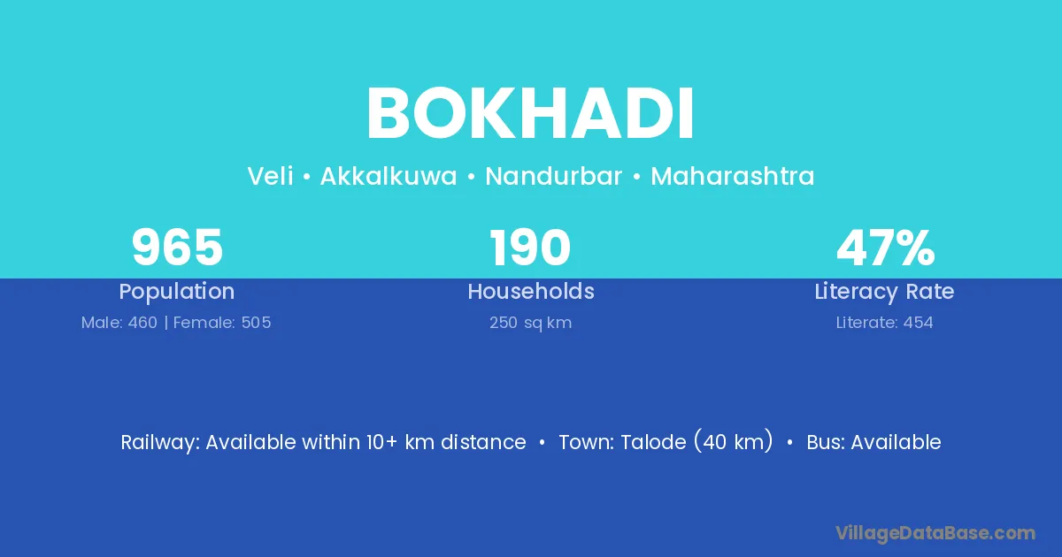 Talode (40 km) is the nearest town to Bokhadi village for major economic activities and is located approximately 40 km away.