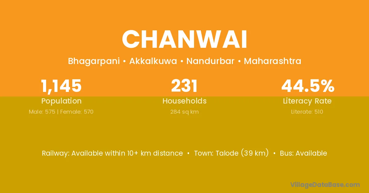 Talode (39 km) is the nearest town to Chanwai village for major economic activities and is located approximately 39 km away.