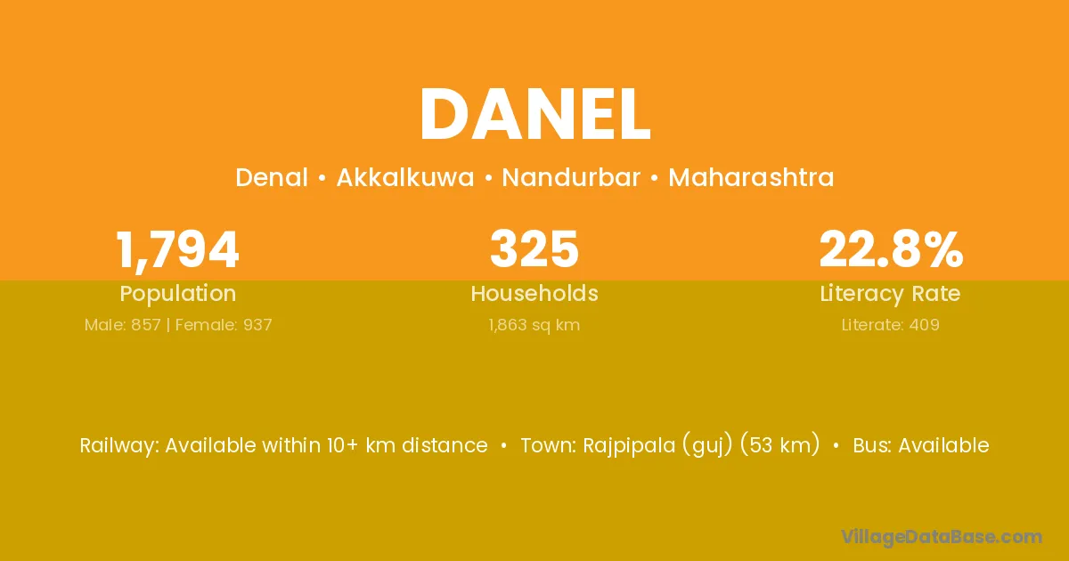Rajpipala (guj) (53 km) is the nearest town to Danel village for major economic activities and is located approximately 53 km away.