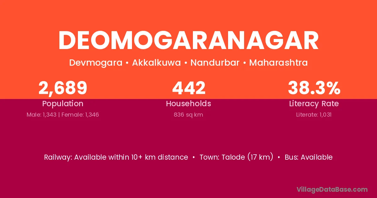 Talode (17 km) is the nearest town to Deomogaranagar village for major economic activities and is located approximately 17 km away.