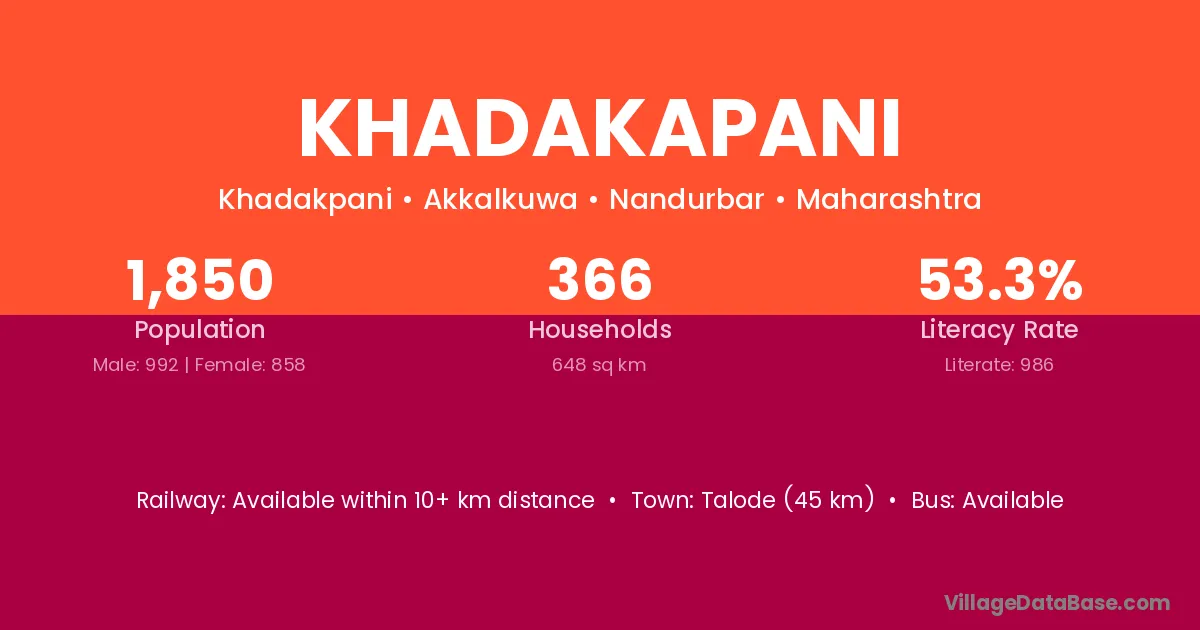 Khadakapani village has a total population of 1,850 people, of which 992 are males and 858 are females.