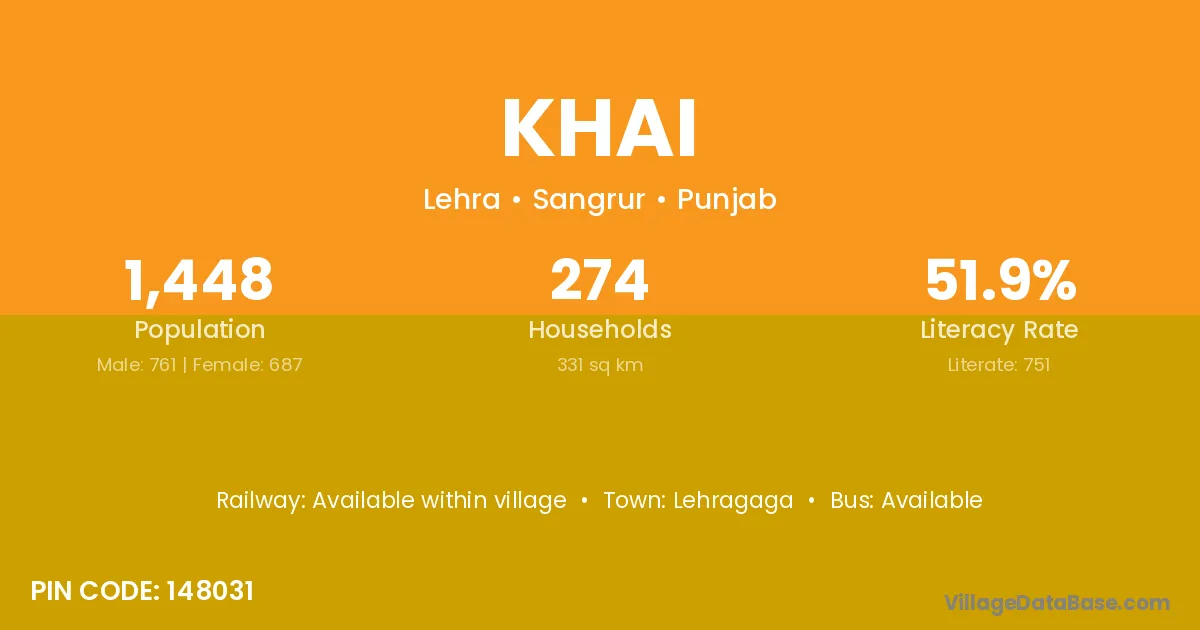 The literacy rate of Khai village is 38.30%. Male literacy stands at 41.76% and female literacy at 34.32%.
