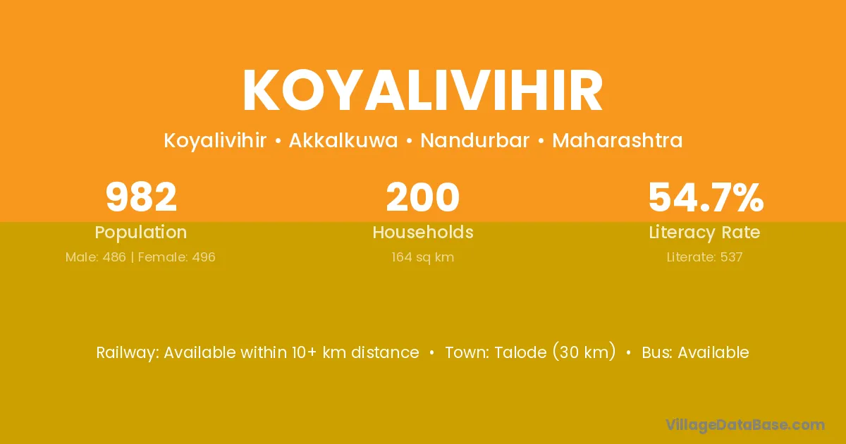Talode (30 km) is the nearest town to Koyalivihir village for major economic activities and is located approximately 30 km away.