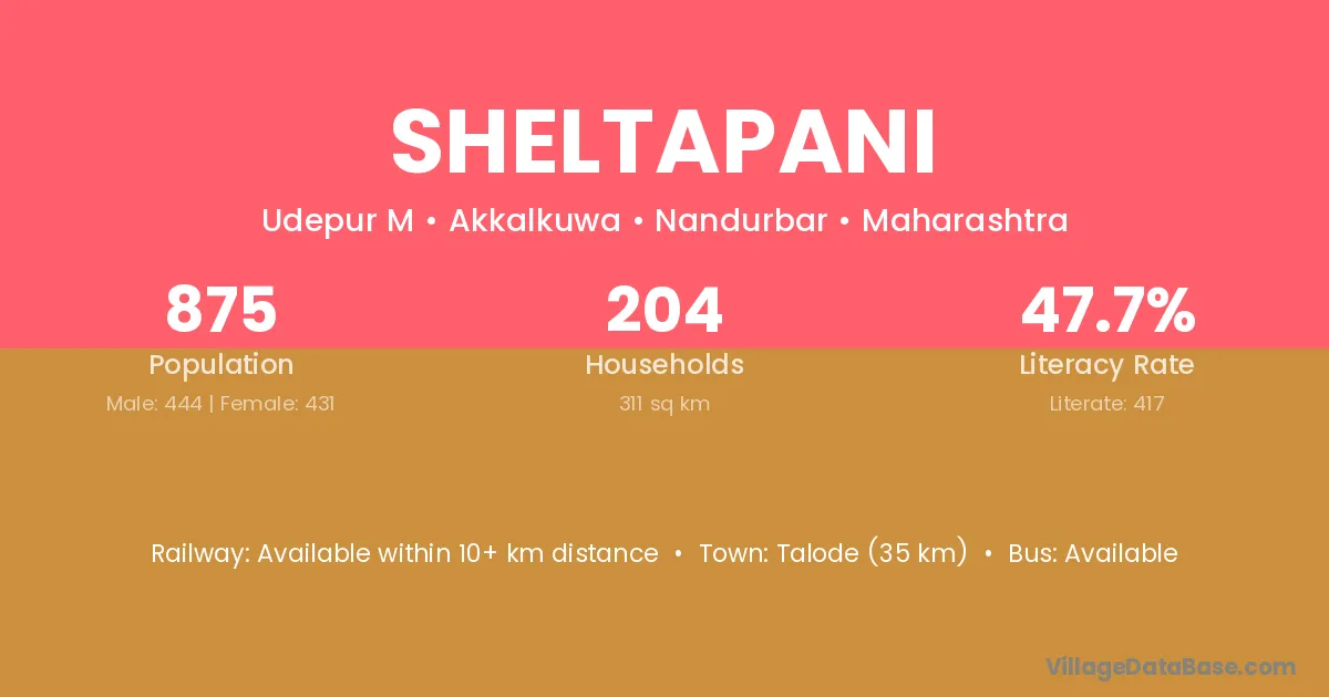 Talode (35 km) is the nearest town to Sheltapani village for major economic activities and is located approximately 35 km away.