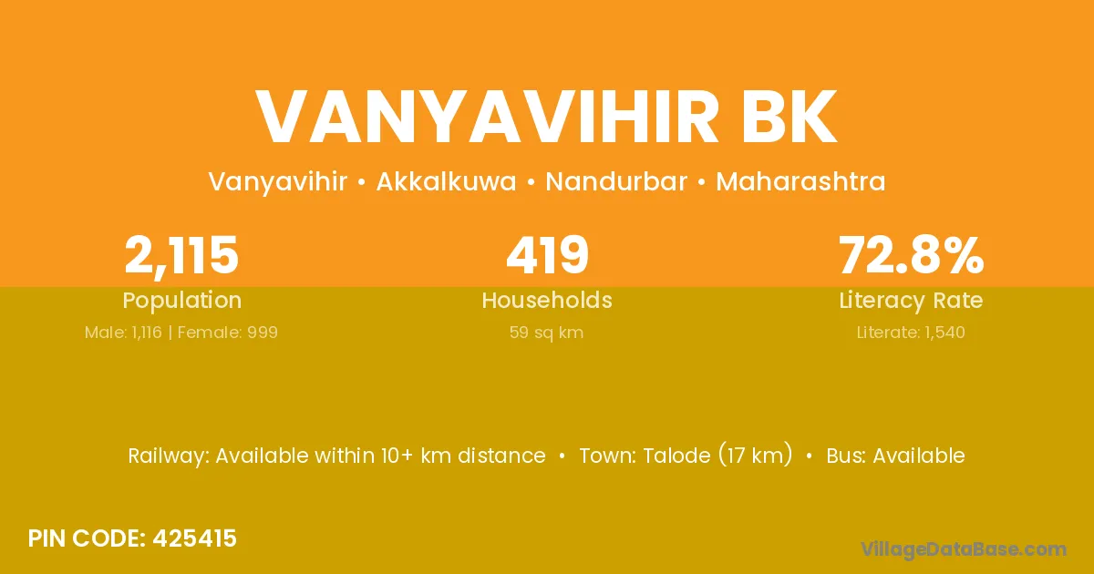 Talode (17 km) is the nearest town to Vanyavihir Bk village for major economic activities and is located approximately 17 km away.
