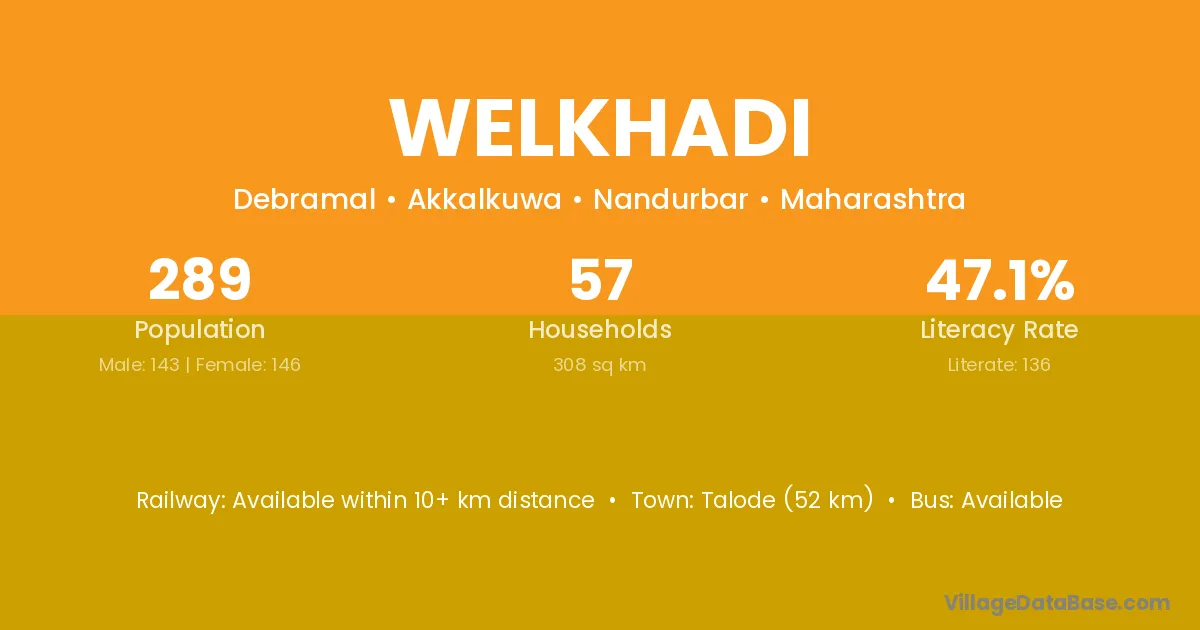 Talode (52 km) is the nearest town to Welkhadi village for major economic activities and is located approximately 52 km away.