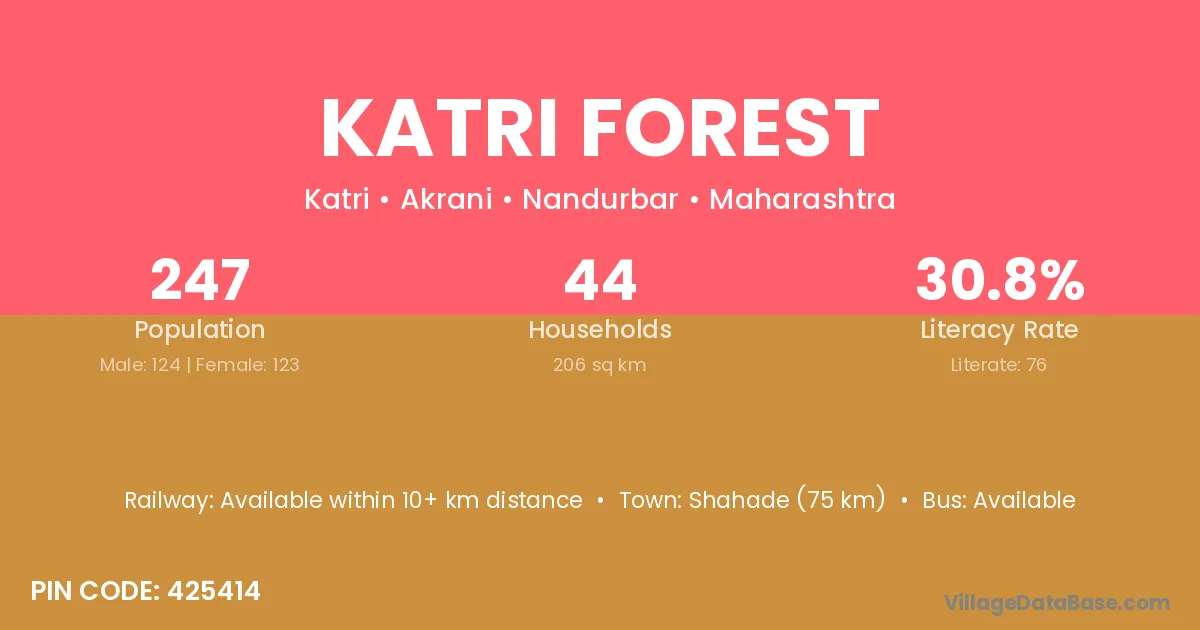 Shahade (75 km) is the nearest town to Katri Forest village for major economic activities and is located approximately 75 km away.