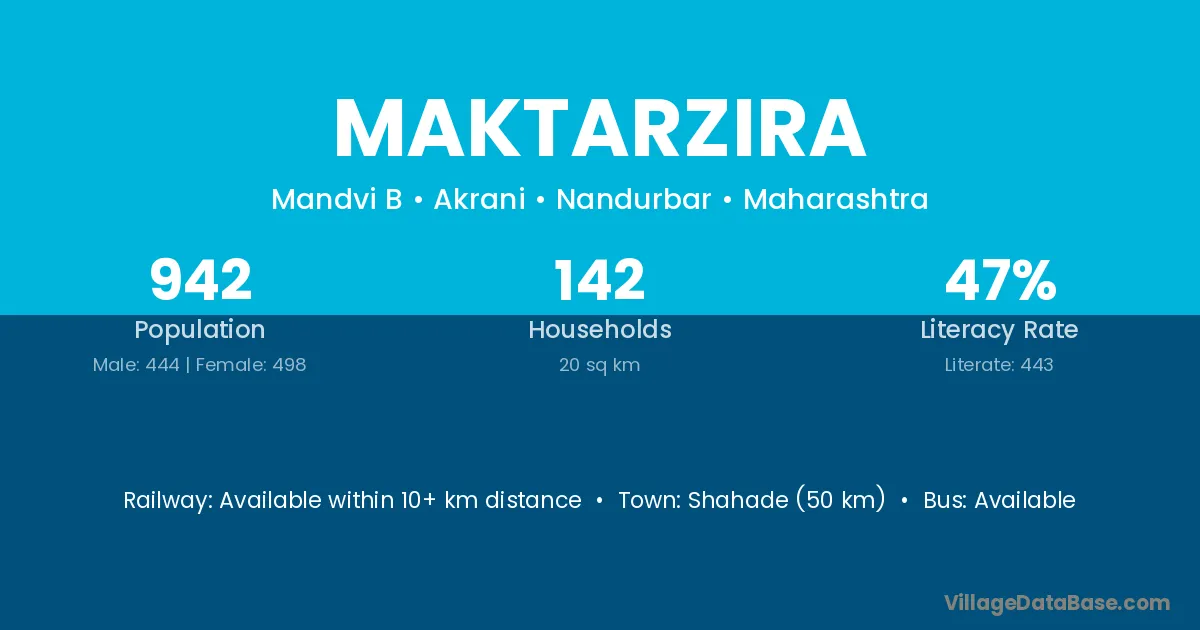 Shahade (50 km) is the nearest town to Maktarzira village for major economic activities and is located approximately 50 km away.