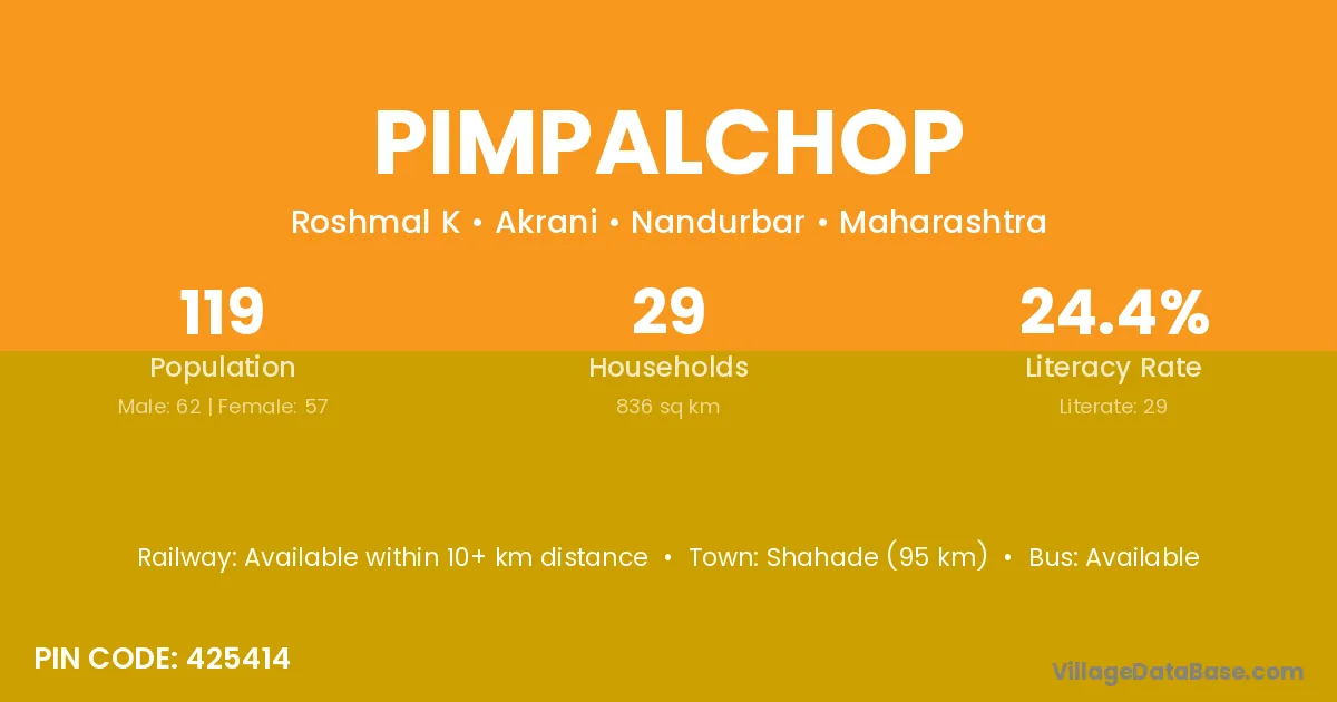 Shahade (95 km) is the nearest town to Pimpalchop village for major economic activities and is located approximately 95 km away.