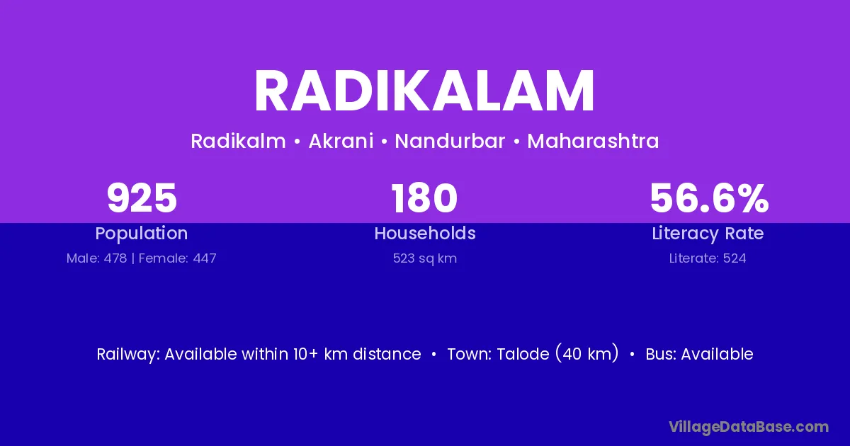 Talode (40 km) is the nearest town to Radikalam village for major economic activities and is located approximately 40 km away.
