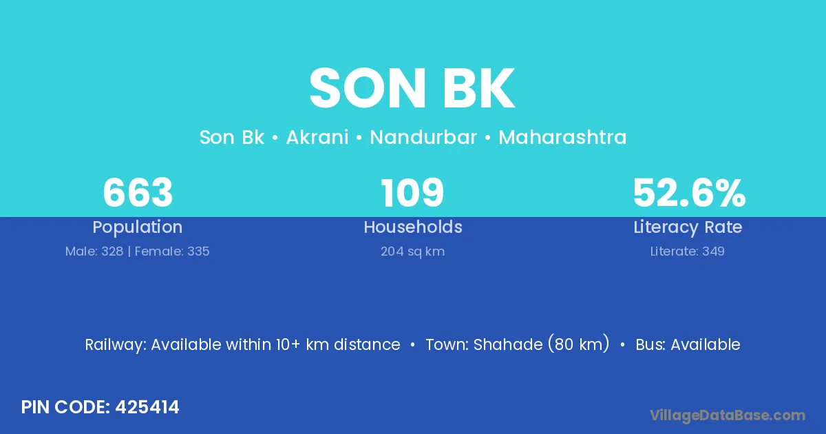 Shahade (80 km) is the nearest town to Son Bk village for major economic activities and is located approximately 80 km away.