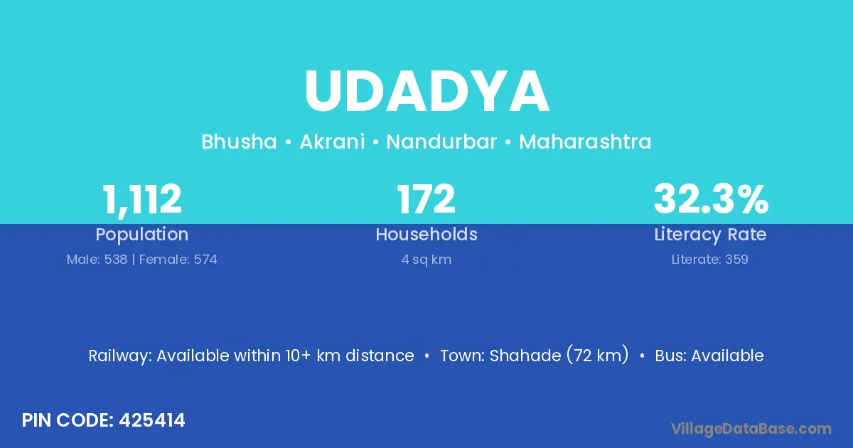 Shahade (72 km) is the nearest town to Udadya village for major economic activities and is located approximately 72 km away.