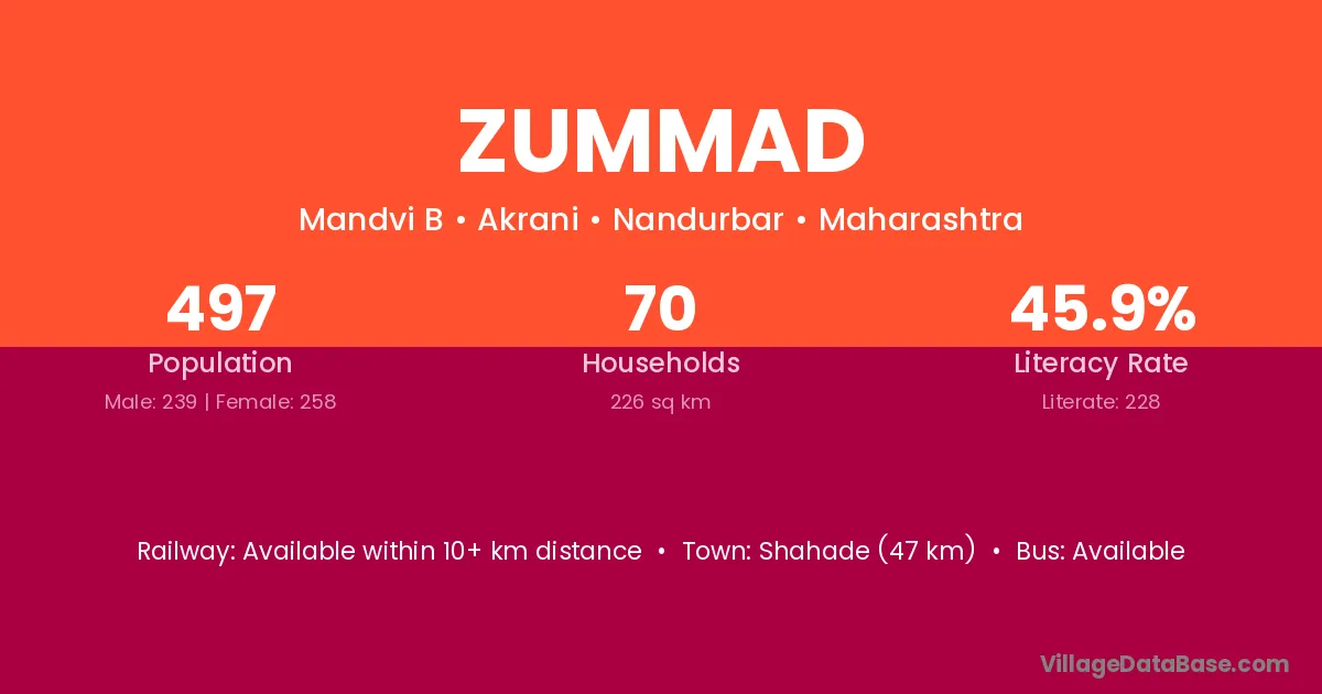 Shahade (47 km) is the nearest town to Zummad village for major economic activities and is located approximately 47 km away.