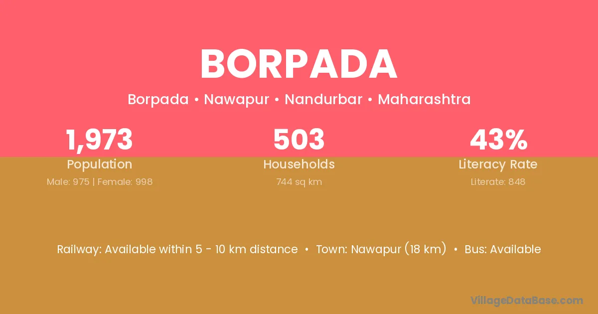 Nawapur (18 km) is the nearest town to Borpada village for major economic activities and is located approximately 18 km away.