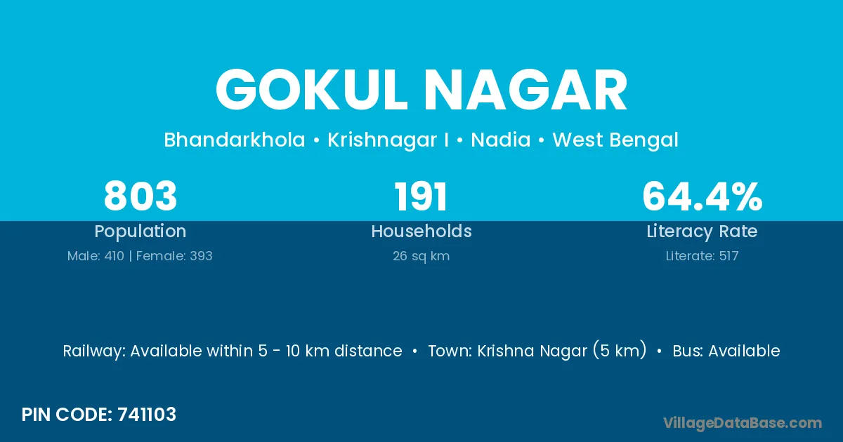 The literacy rate of Gokul Nagar village is 40.56%. Male literacy stands at 45.26% and female literacy at 35.75%.