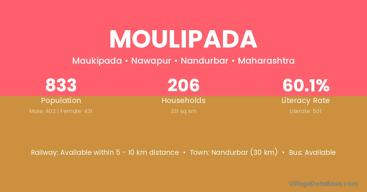 Nandurbar (30 km) is the nearest town to Moulipada village for major economic activities and is located approximately 30 km away.