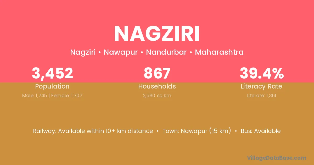 Nawapur (15 km) is the nearest town to Nagziri village for major economic activities and is located approximately 15 km away.