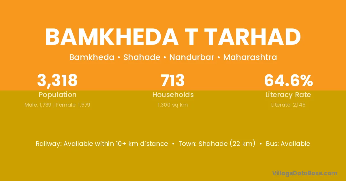 Bamkheda T Tarhad village has a total population of 3,318 people, of which 1,739 are males and 1,579 are females.