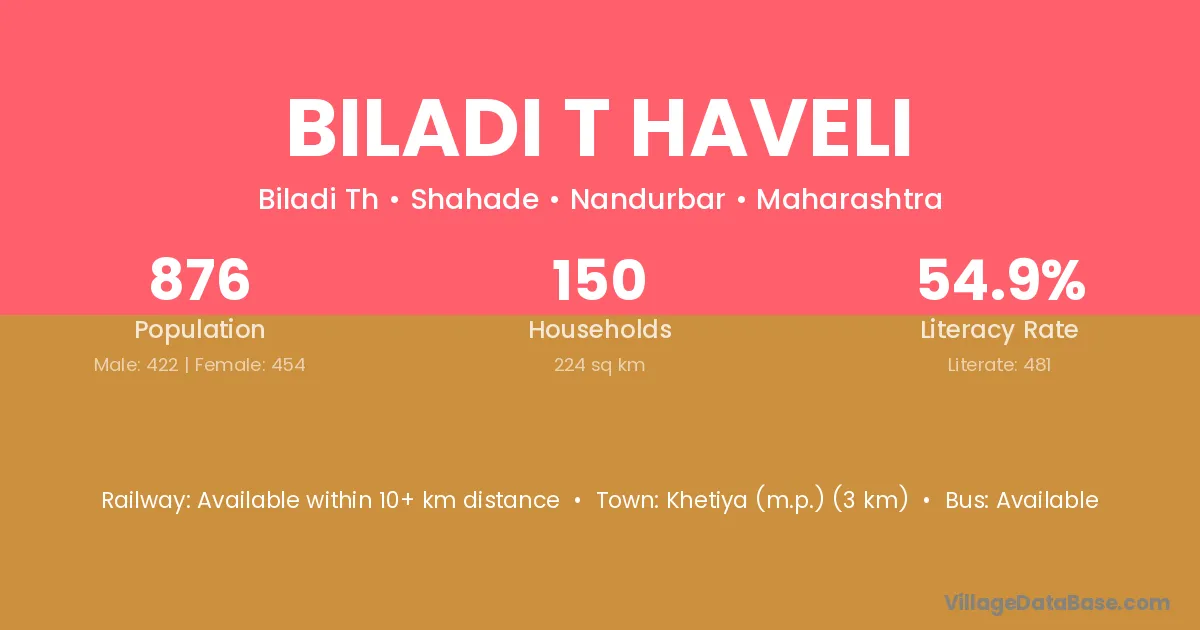 Khetiya (m.p.) (3 km) is the nearest town to Biladi T Haveli village for major economic activities and is located approximately 3 km away.