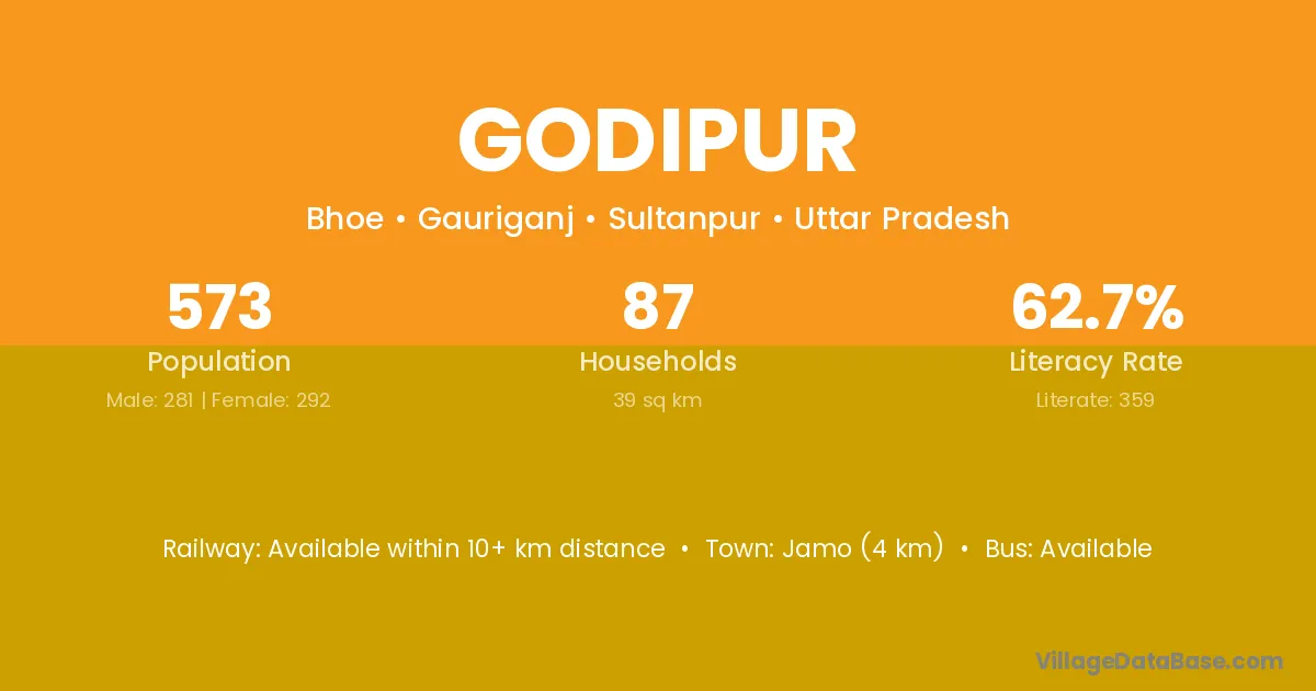 The literacy rate of Godipur village is 40.03%. Male literacy stands at 46.69% and female literacy at 33.49%.