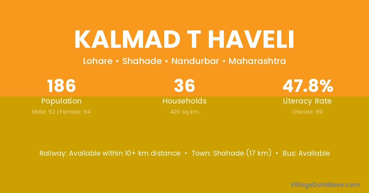 Shahade (17 km) is the nearest town to Kalmad T Haveli village for major economic activities and is located approximately 17 km away.