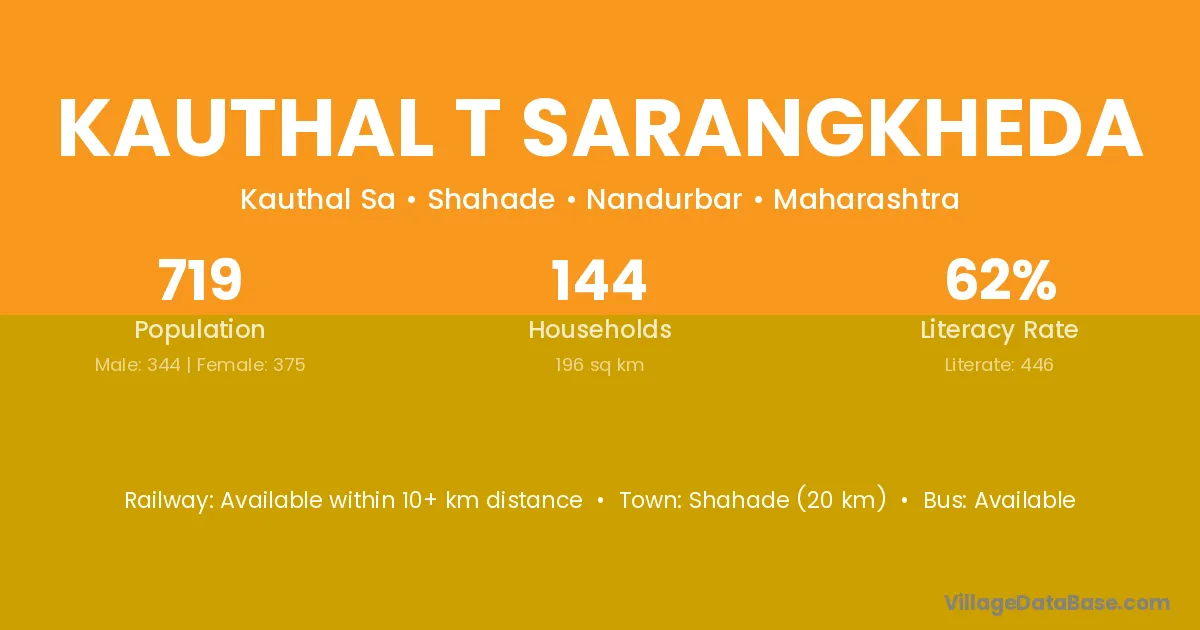 Shahade (20 km) is the nearest town to Kauthal T Sarangkheda village for major economic activities and is located approximately 20 km away.