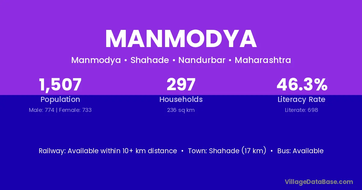 Shahade (17 km) is the nearest town to Manmodya village for major economic activities and is located approximately 17 km away.