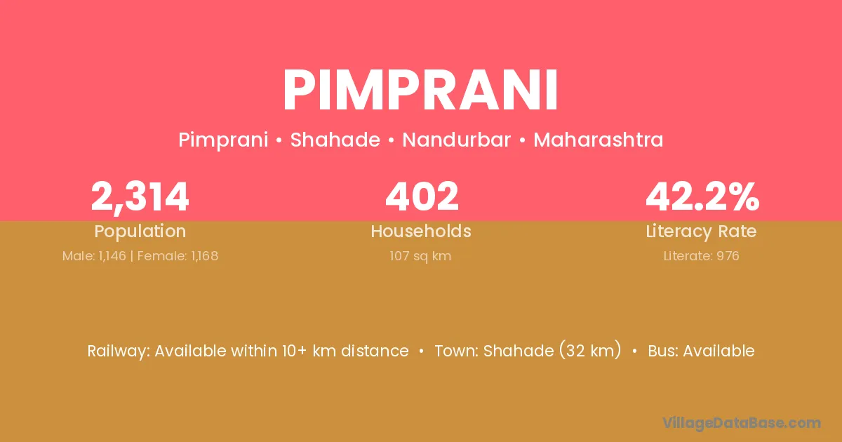 Shahade (32 km) is the nearest town to Pimprani village for major economic activities and is located approximately 32 km away.