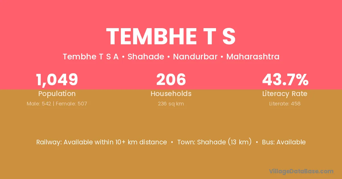 Shahade (13 km) is the nearest town to Tembhe T S village for major economic activities and is located approximately 13 km away.