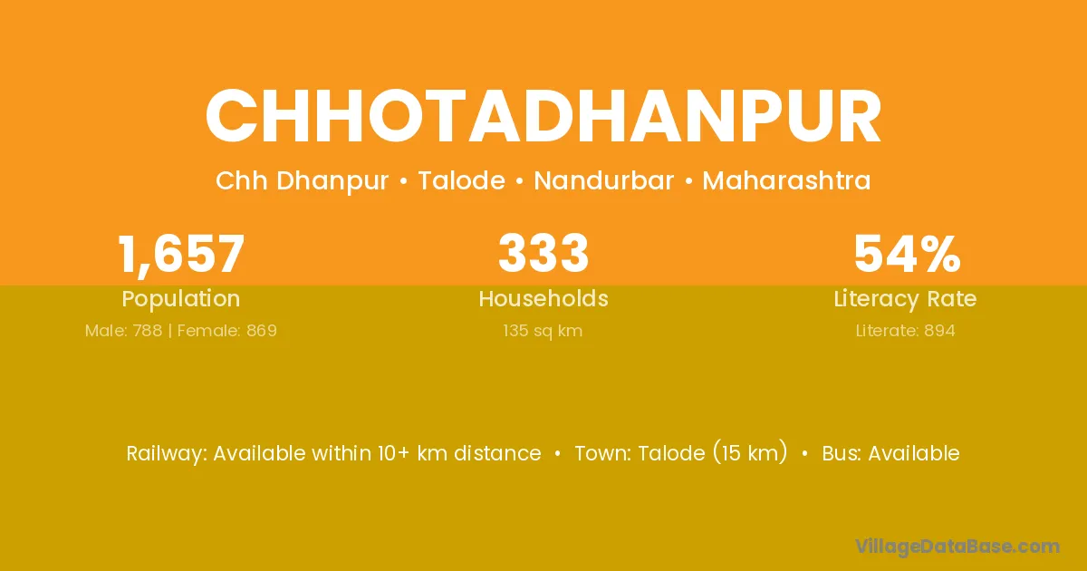 Talode (15 km) is the nearest town to Chhotadhanpur village for major economic activities and is located approximately 15 km away.