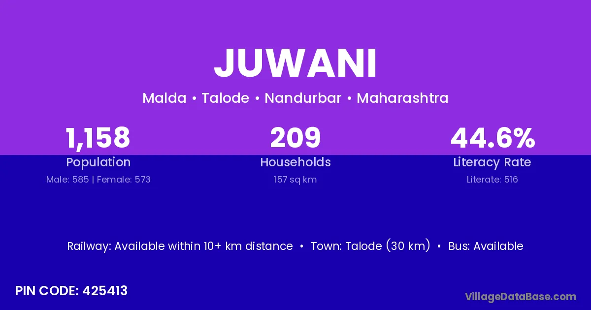 Talode (30 km) is the nearest town to Juwani village for major economic activities and is located approximately 30 km away.