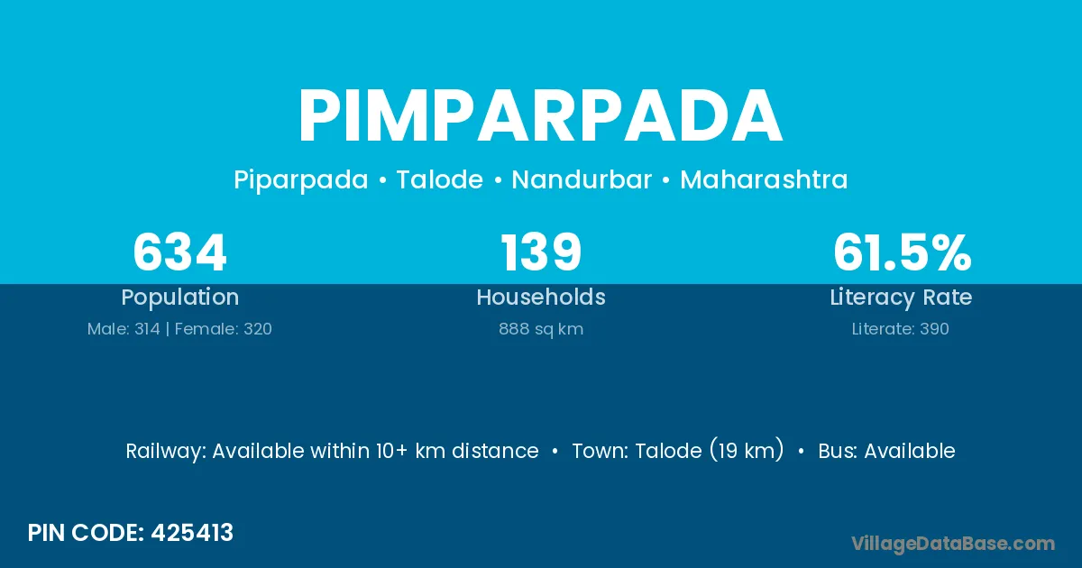 Talode (19 km) is the nearest town to Pimparpada village for major economic activities and is located approximately 19 km away.
